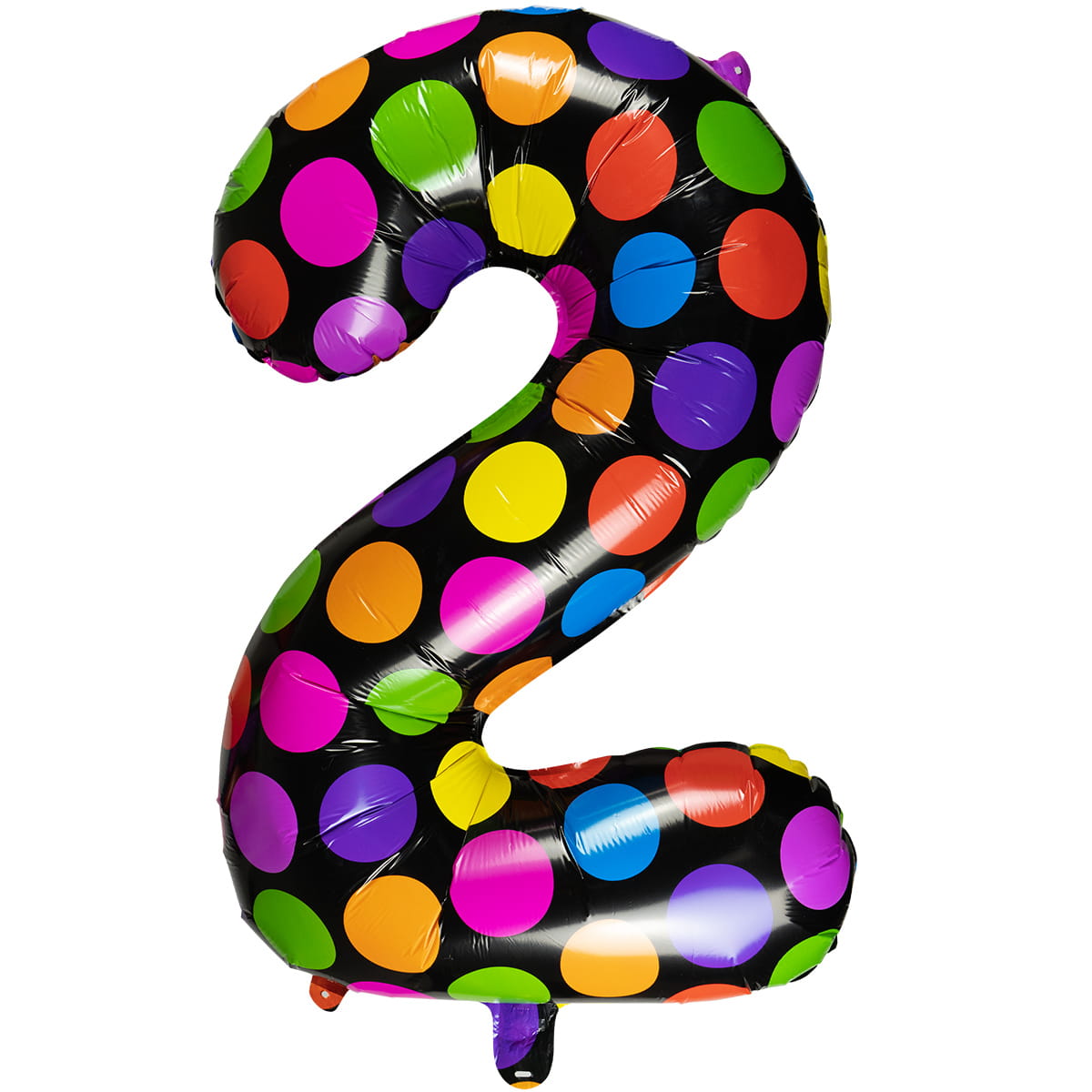 Balon foliowy w kształcie cyfry 2. Balon w kolorze czarnym w kolorowe kropeczki. Element dekoracyjny imprez urodzinowych, noworocznych i tematycznych. Balon można napełniać powietrzem lub helem. Balon posiada samozaciskający się wentyl - nie trzeba go dodatkowo wiązać. Duża cyfra o wysokości 61 cm po napompowaniu.