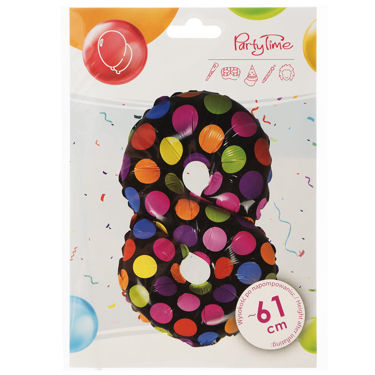 Balon foliowy w kształcie cyfry 8. Balon w kolorze czarnym w kolorowe kropeczki. Element dekoracyjny imprez urodzinowych, noworocznych i tematycznych. Balon można napełniać powietrzem lub helem. Balon posiada samozaciskający się wentyl - nie trzeba go dodatkowo wiązać. Duża cyfra o wysokości 61 cm po napompowaniu.
