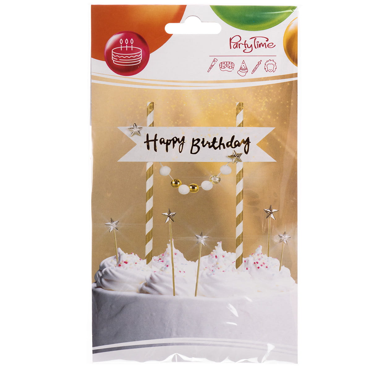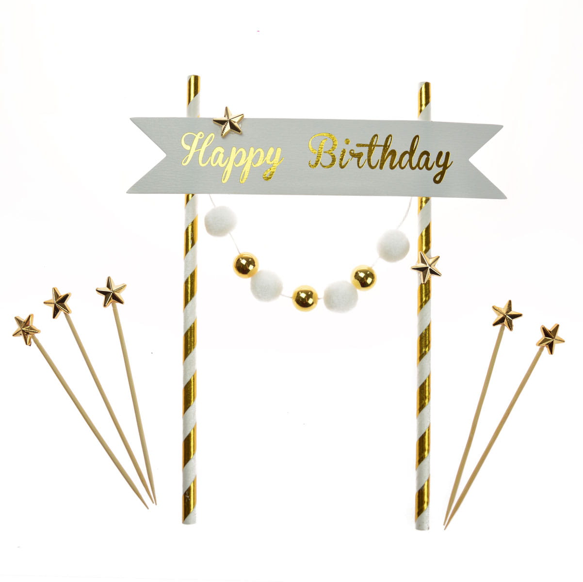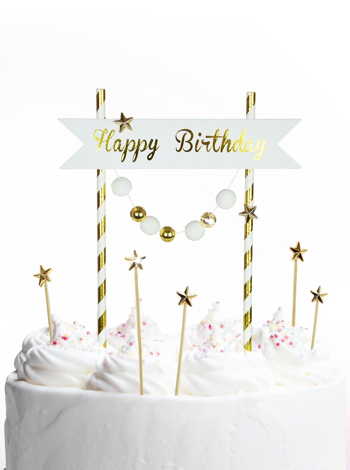 Dekoracja tortu Happy Birthday - pomponiki złote