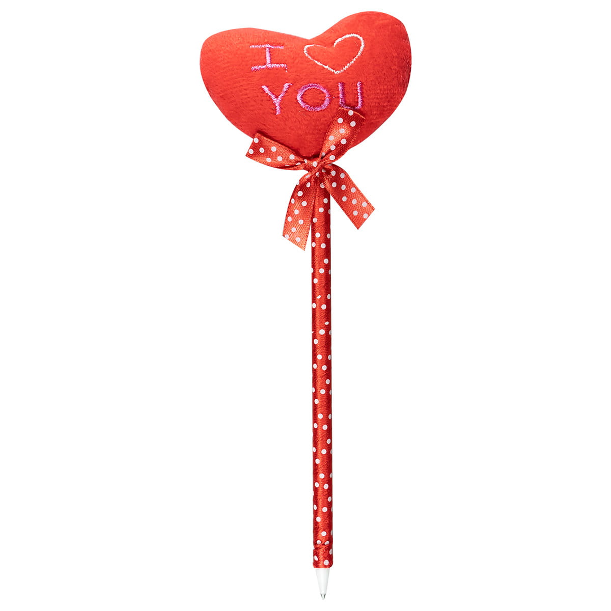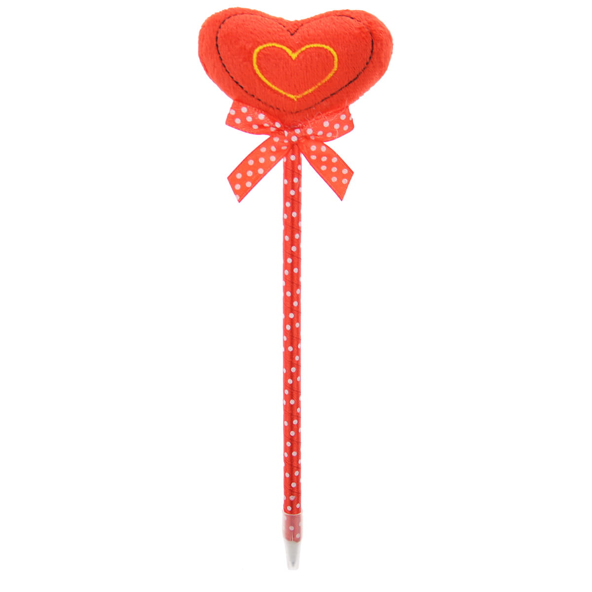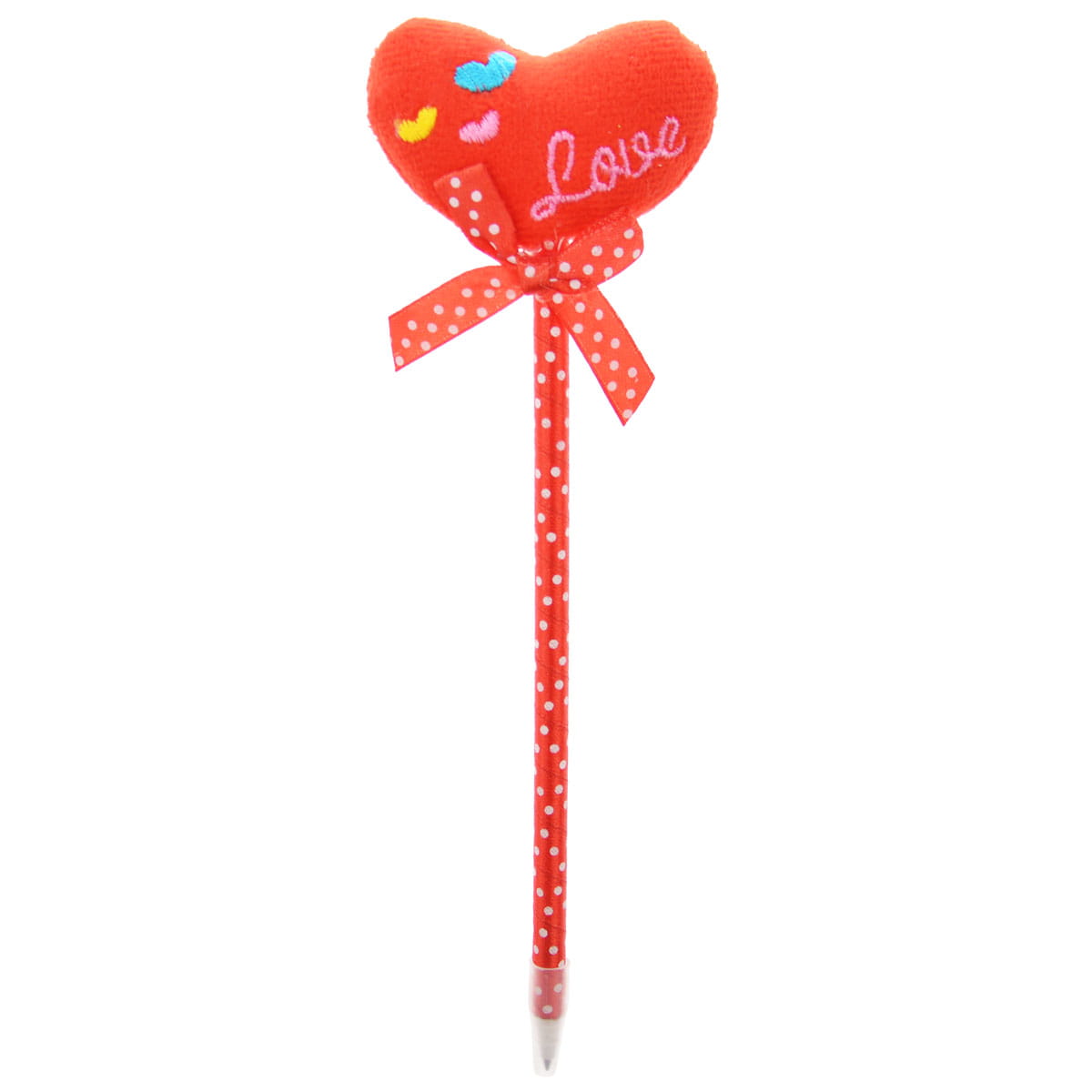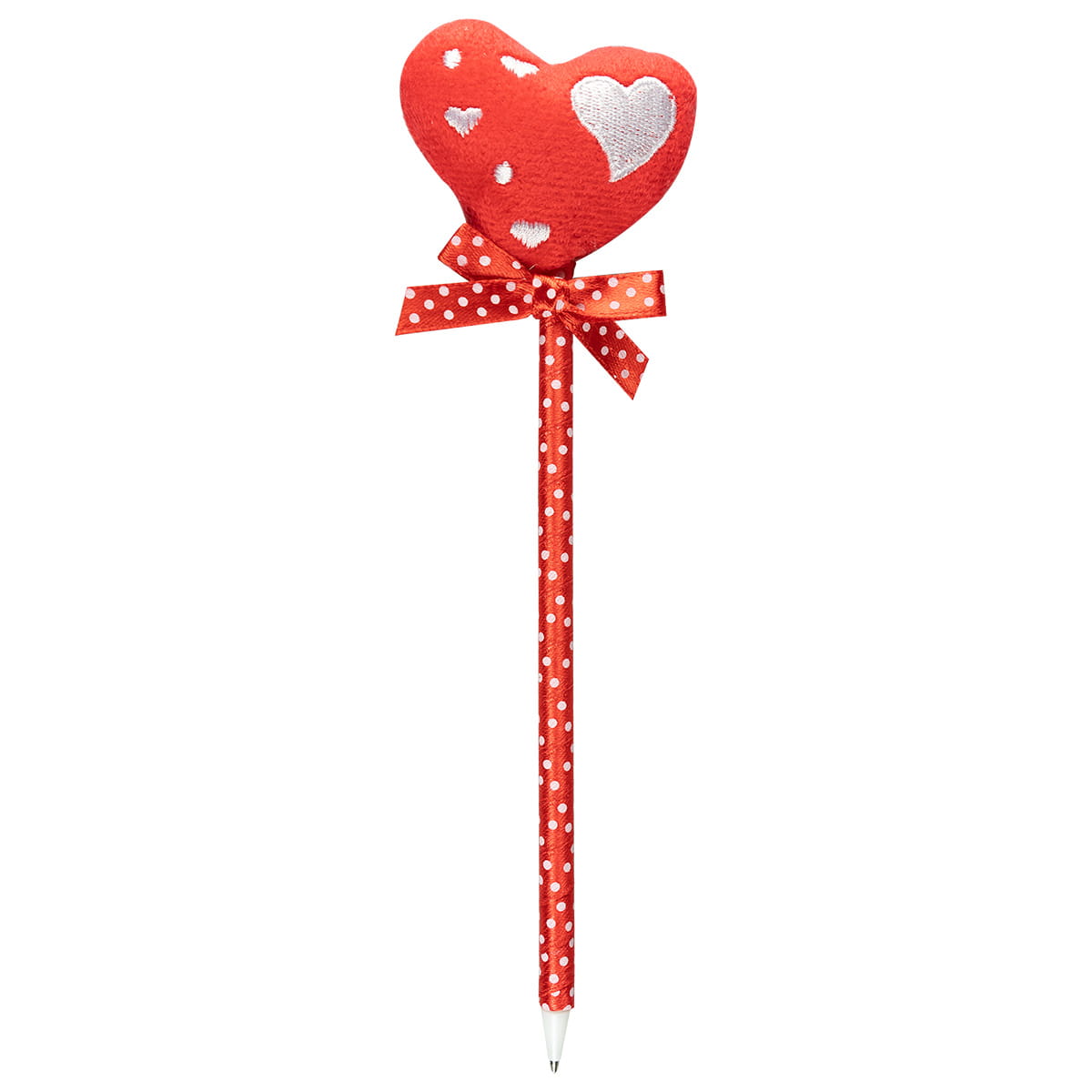 Długopis ozdobiony wstążeczką i miękkim serduszkiem z różnymi aplikacjami. Wymiar serduszka 6x5,5 cm. Długość całkowita ok 22 cm.
