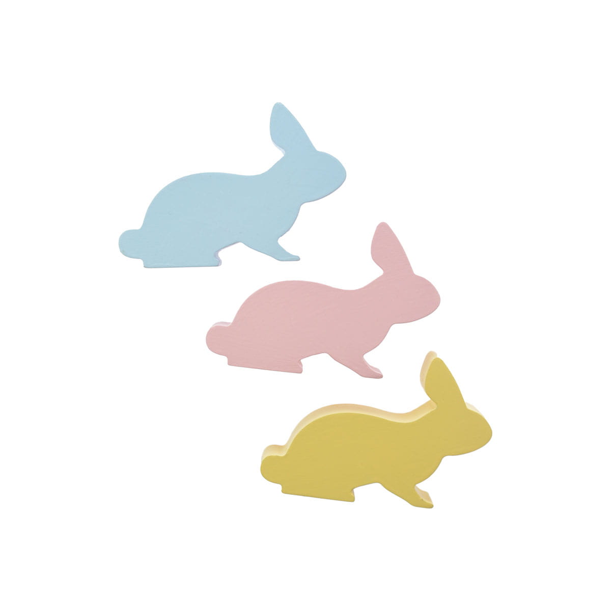 Stylowa dekoracja wielkanocna w formie zajączka, wykonana z drewna i pomalowana w pastelowych, wiosennych kolorach. Minimalistyczna forma oraz subtelna kolorystyka sprawiają, że ozdoba doskonale wpisuje się zarówno w nowoczesne, jak i klasyczne wnętrza. Idealna jako dodatek do świątecznych aranżacji, stroików, koszyczków lub dekoracji stołu.