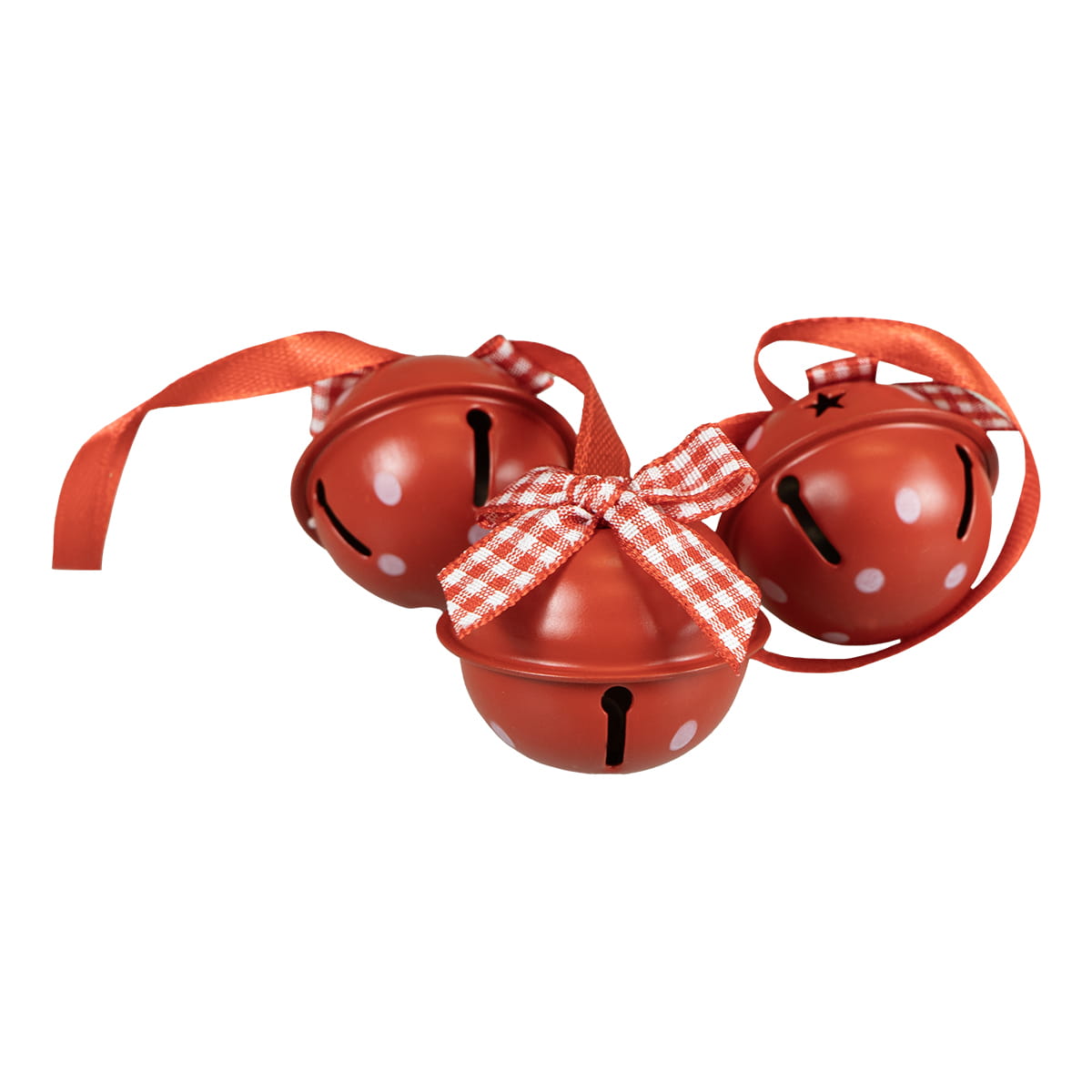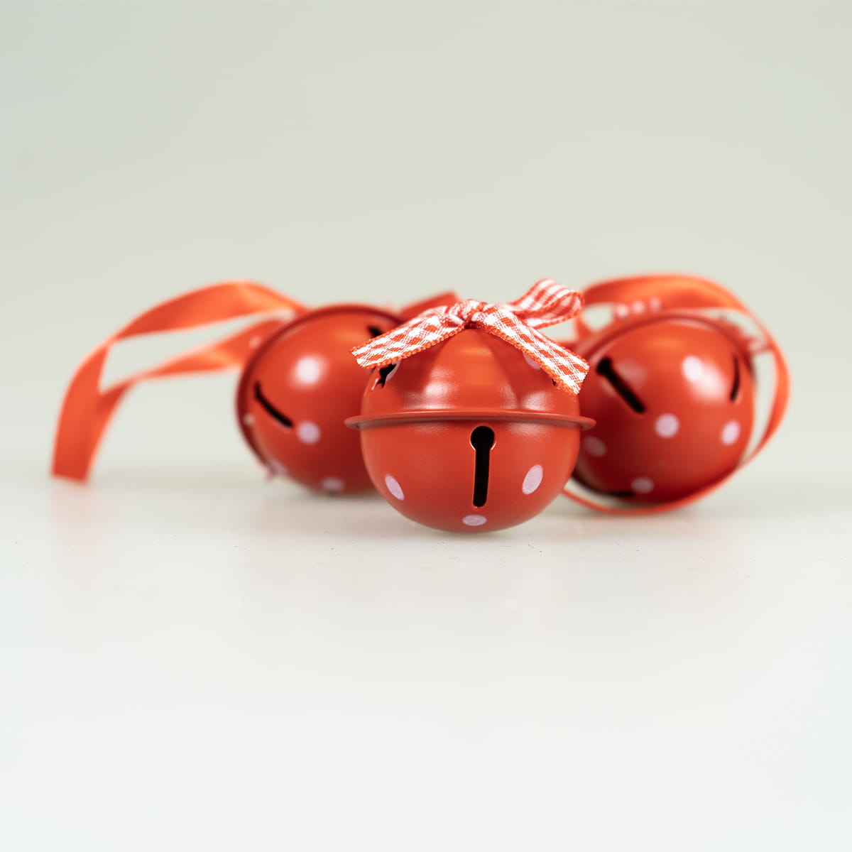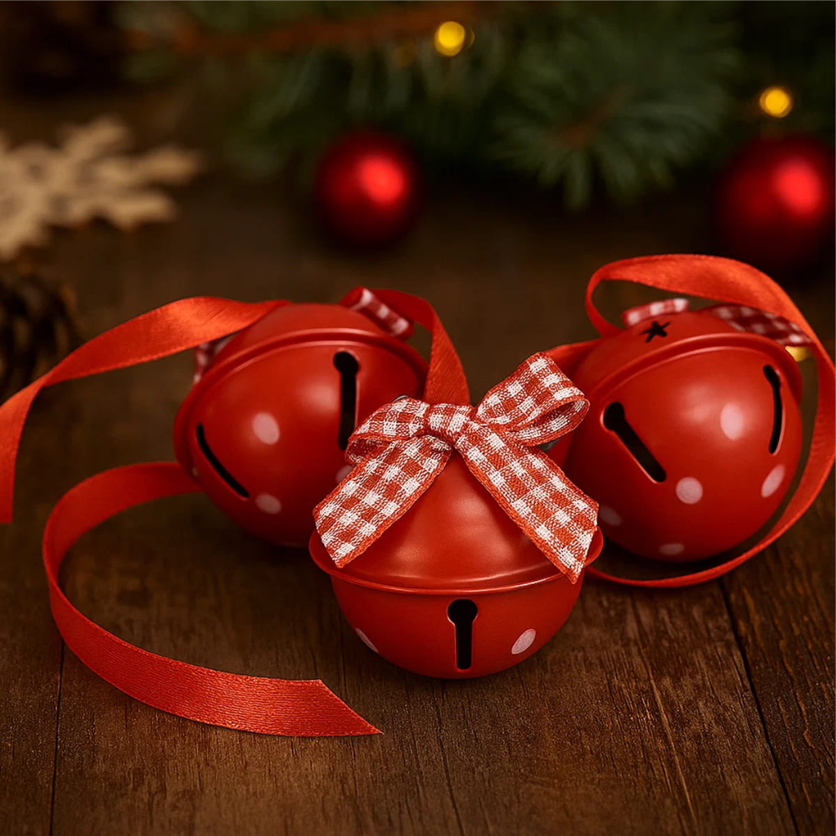 Czerwone dzwoneczki dekoracyjne ozdobione są klasyczną kokardką w biało-czerwoną kratkę. To tradycyjny symbol świąt, który dodaje każdej aranżacji uroku i tradycyjnego ciepła.