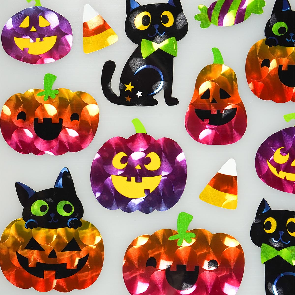 Zestaw kolorowych naklejek z motywem Halloween. Naklejki metalizowane, mieniące się w świetle. Mix wzorów na blistrze. Naklejki do dekoracji kartek, zaproszeń na zabawy halloweenowe, prace szkolne, na dekoracje jesienne. Blister o wymiarze 14x25 cm.
