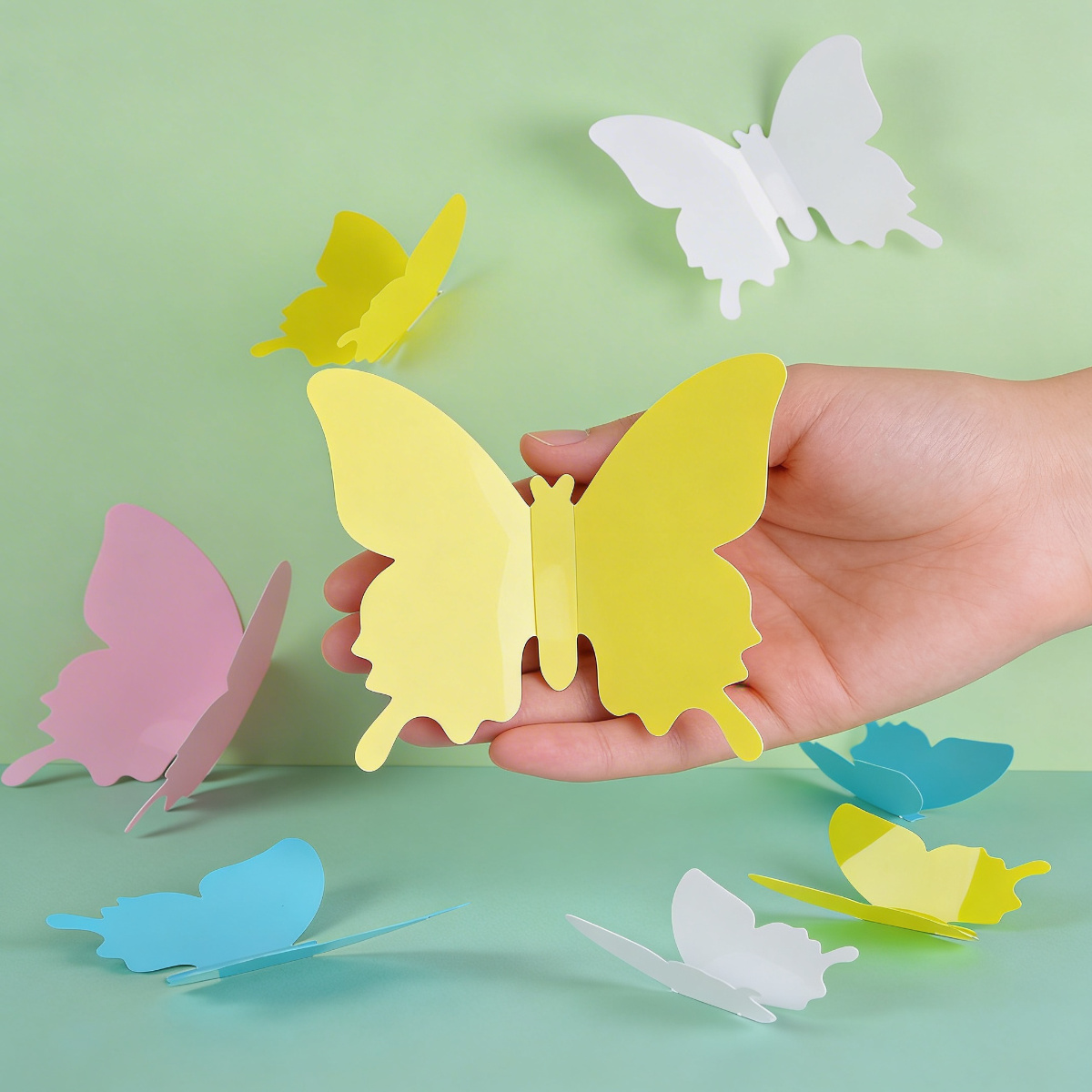 W komplecie 12 motylków w pastelowych kolorach (żółty, różowy, biały, niebieski).