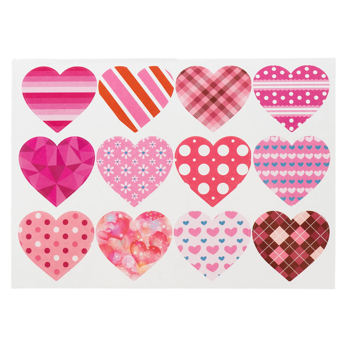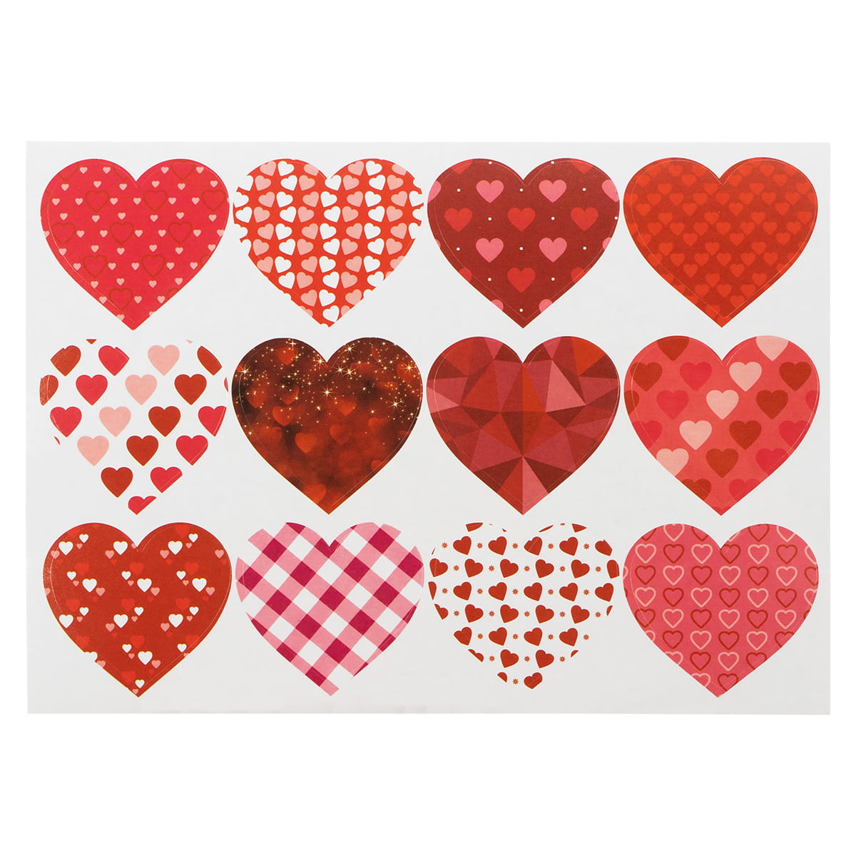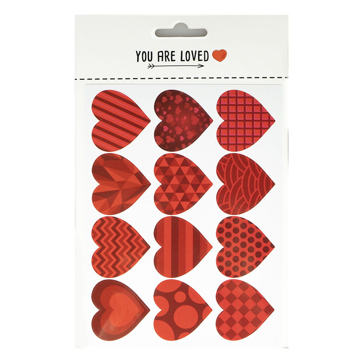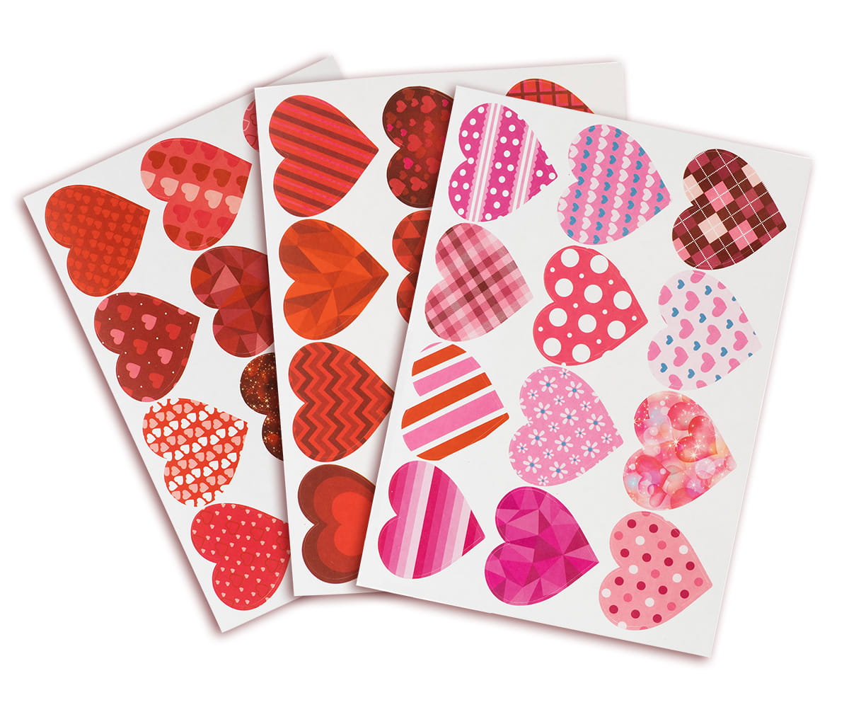 Naklejki dekoracyjne w kształcie serduszek. Serduszka posiadają ozdobne wzory. Idealne do dekoracji kartek walentynkowych, albumów ze zdjęciami, laurek, zaproszeń, prac szkolnych. 12 naklejek na blistrze o wymiarze 12 cm x 16,5 cm. Mix wzorów i kolorów.