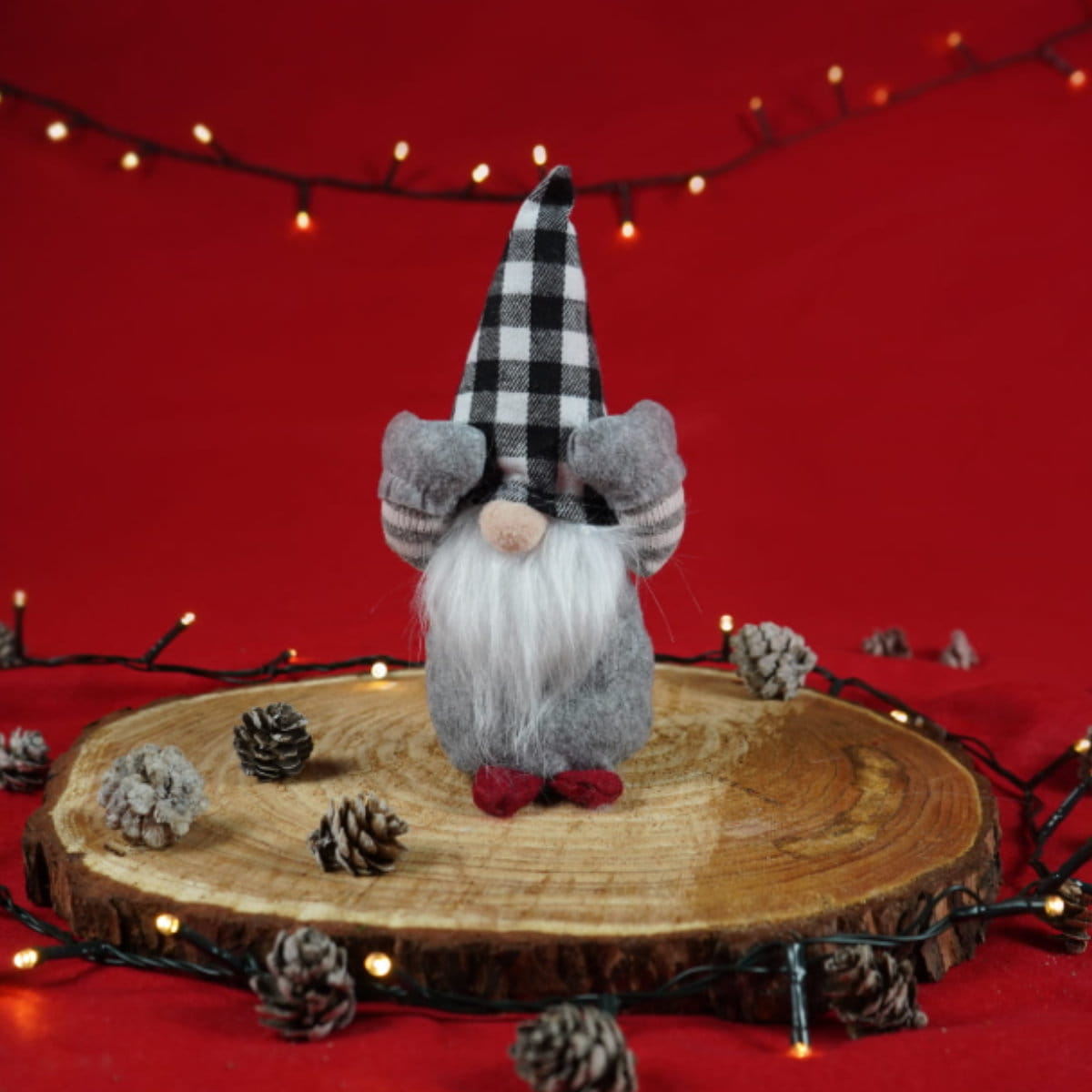 - Charakterystyczna kraciasta czapka - dodaje skrzatowi wyjątkowego, zimowego stylu.