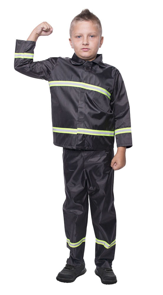 Przebranie dla dziecka - strażak. W skład zestawu wchodzi bluza z długimi rękawami oraz spodnie. Strój w kolorze czarnym. Z tyłu posiada napis "STRAŻ". Przebranie na bal przebierańców, halloween, zabawy tematyczne, zabawy w przedszkolu i szkole.