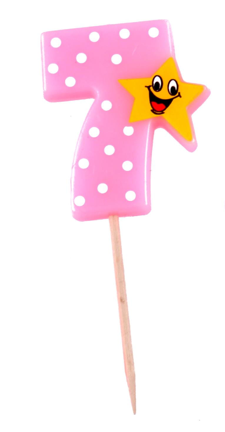 Świeczka urodzinowa różowa cyferka w białe kropeczki z gwiazdką na drewnianej szpilce