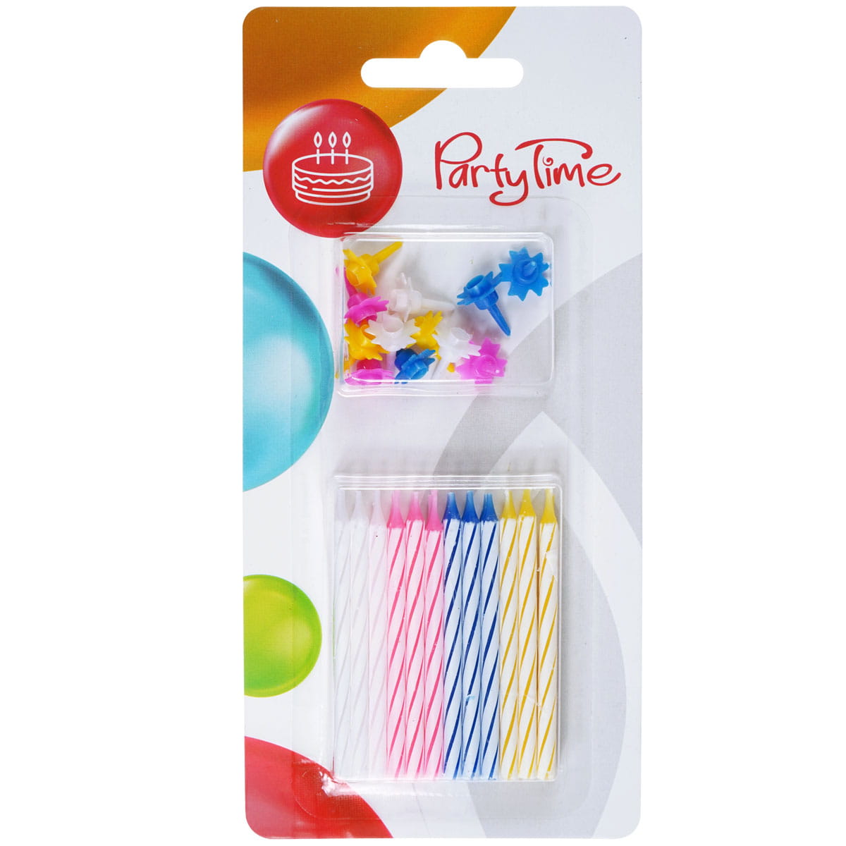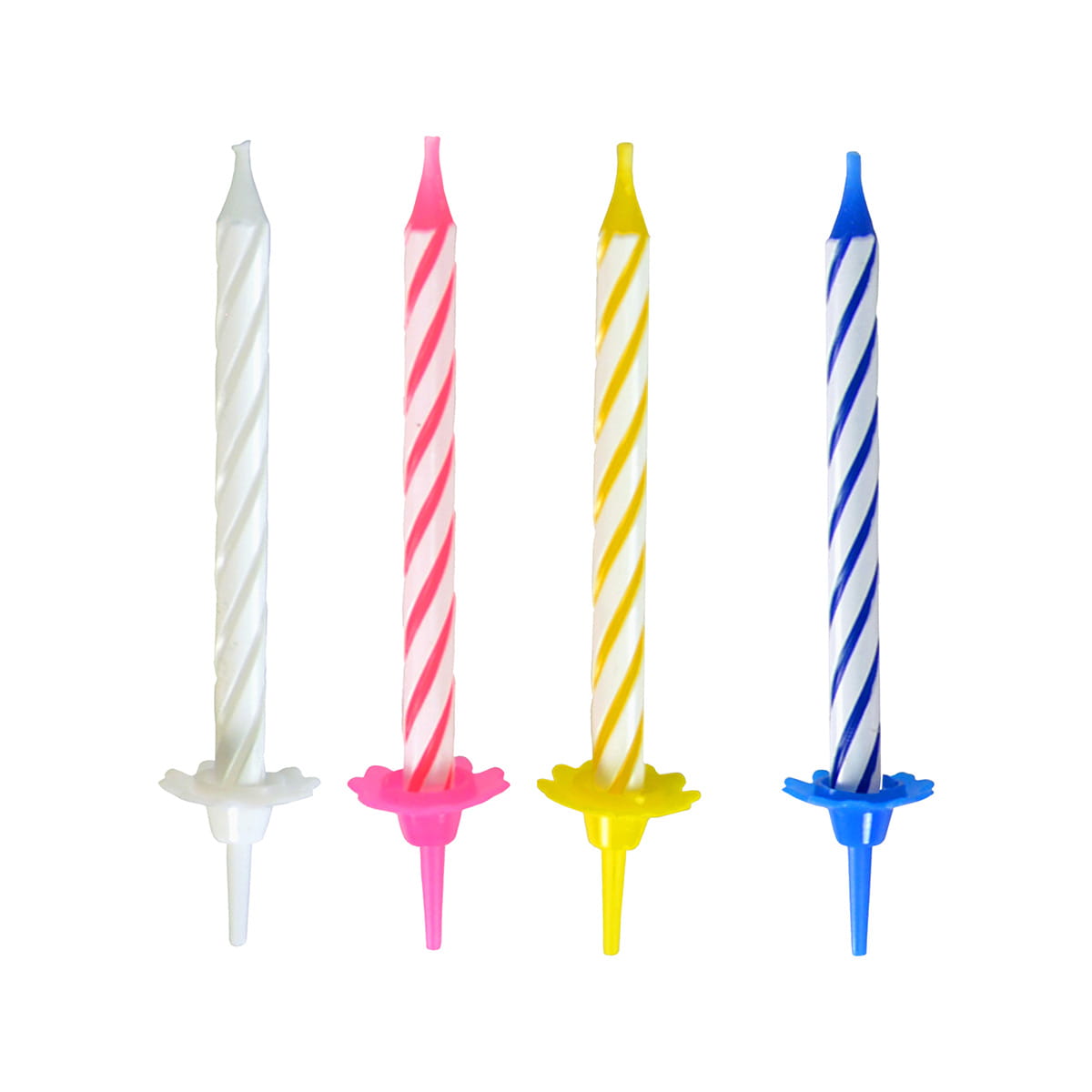 Świeczki dostępne są w czterech kolorach: białym, różowym, żółtym i niebieskim, a każda z nich wyposażona jest w praktyczną plastikową podstawkę w dopasowanym kolorze, która umożliwia łatwe i stabilne umieszczenie świeczki na torcie, jednocześnie chroniąc ciasto przed spływającym woskiem.